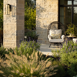 The experience begins before you reach the front door. A graceful roundabout driveway curves through native grasses and softly mounded beds, guiding you gently home. The hardscape is warm and honed, echoing the limestone of the façade, while layered plantings ground the space with color and texture.